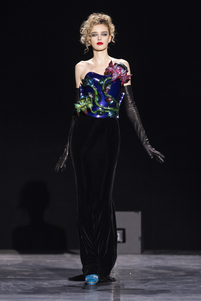 Une certain sens de la fête régnait sur le podium du défilé Julien Fournié, entre robe à strass et bibi satiné. En maquillage, cet esprit de nuit se traduit par des regards intenses à base de faux-cils XXL, strass à même la peau et smoky-eyes noir, associés à des lèvres rouge sang.