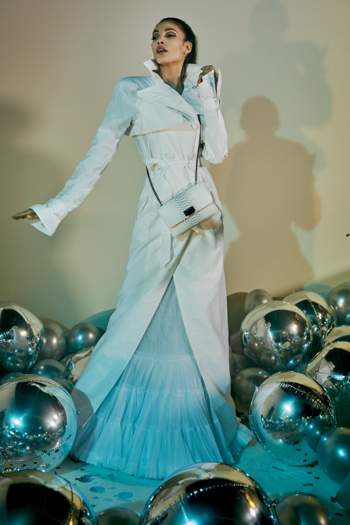 Robe trench blanche en jacquard de soie et lurex de la Collection Première Tempête et Sac à main Premier Smoke