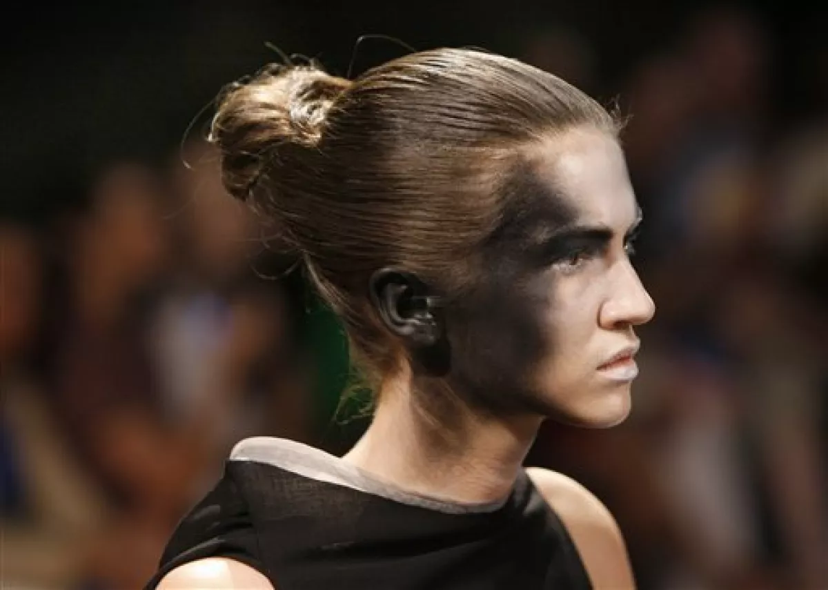 With transfixed upward gazes and their smudged palms held forward like sleepwalkers, the models minced around the catwalk in long, lean gowns in translucent fabric, with strategically placed opaque paneling and covered in dark ink smudges. Scarlet Swarovski crystals glinted like fresh bloodstains dripping down the shoulders of one dress, while terrible scenes of Medieval torture – showing little figures on the stake – enlivened its hemline.