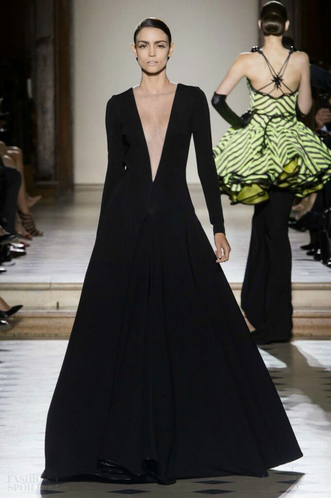 La soprano portait une robe iconique Julien Fournié Haute Couture en jersey de viscose noir avec un décolleté en « V » vertigineux, de la collection Première Pulsion.