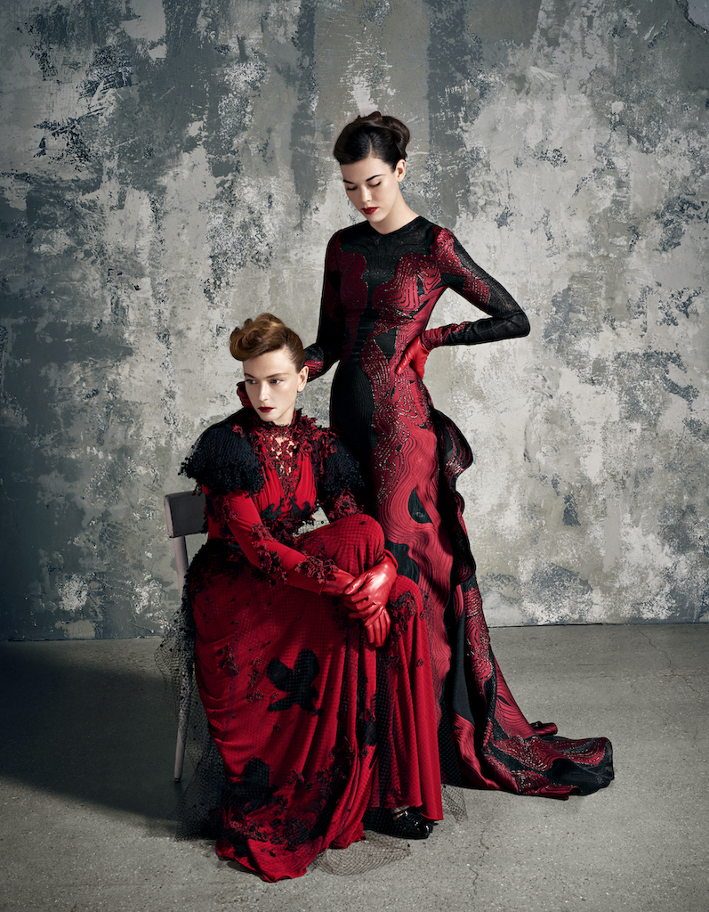 Cette robe Haute Couture (à gauche sur la première photo) est en jersey de viscose et coton rubis incrustée de dentelles à motifs corbeaux et corneilles et brodée de voilettes à chapeaux noires et micro pompons de velours noir.