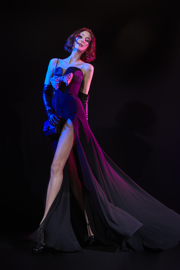 La jeune actrice qui figure dans le premier court métrage de la comédienne césarisée Déborah Francois intitulé Mouton Noir était dans une robe bustier noir en rabane de soie laquée et georgette de soie de la collection First Love.