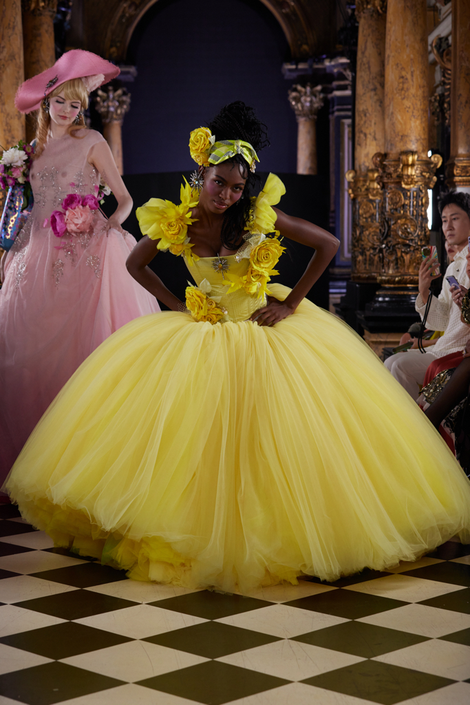 Une grande robe brodée tournoie et dévoile, sous une capeline de « Merveilleuse », un camaïeu de pivoine, de rose tendre et d’églantine dans diverses matières précieuses jouant sur la superposition de leurs transparences. Pour marquer l’universalité du style Marie-Antoinette, un bustier bijouté et fleuri dans les tons de canari sur un jupon géant de tulles assortis est présenté sur le corps ébène de Tobi Momoh, égérie de Julien Fournié.