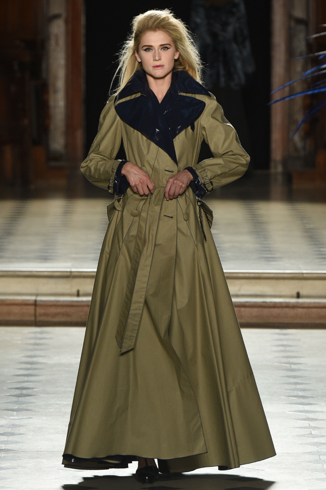 La coupe des vestes, des manteaux et des robes trompe-l’œil de manteau, emprunte au vocabulaire militaire sa rigueur. L’autorité d’une carrure renforcée et de boutonnages apparents sur le haut, laisse le tissu se déployer sous la taille dans les plis de basques arrière ou ajouter de l’ampleur à la marche dans les pièces qui descendent à la cheville. Ailleurs, une veste en fourrure de fils dégradés mixe les franges aux fils hérissés pour accentuer le caractère animal.
