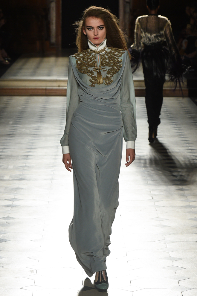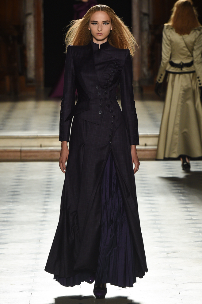 Maîtrisant tous les arcanes de la coupe, le couturier français modernise en diaboliques beautés les silhouettes mythiques des magiciennes, des empoisonneuses, des héroïnes de romans gothiques ou des stars de films noirs. Cols montants, plastrons brodés sur chemisiers en mousseline plissée s’associent à de longues jupes.