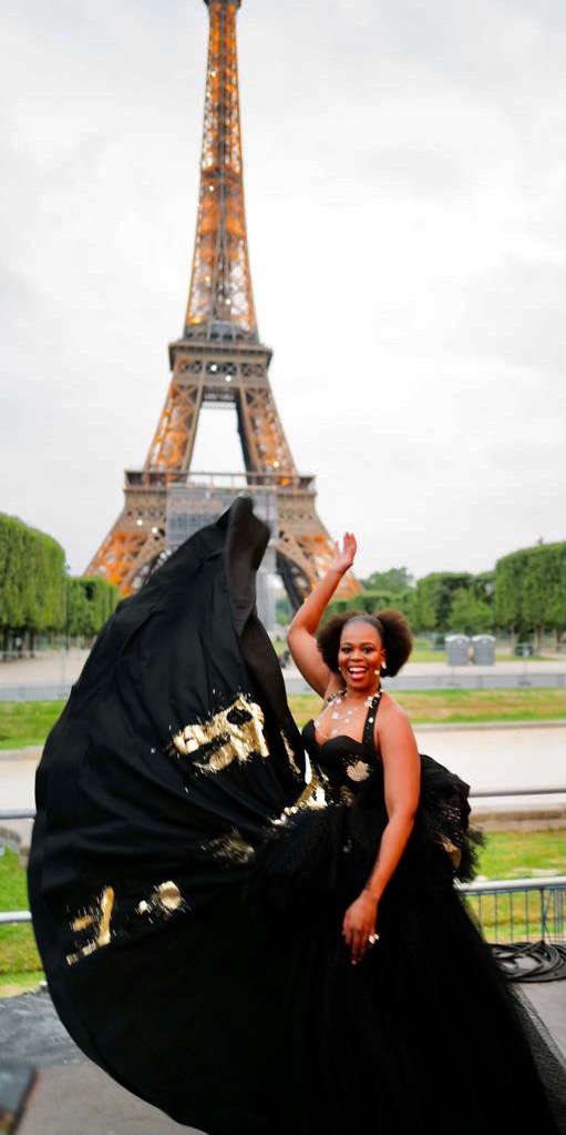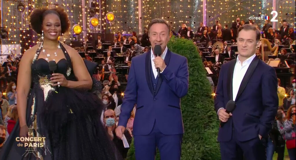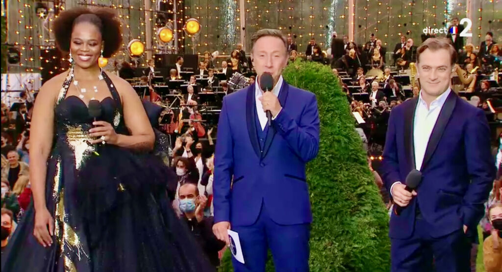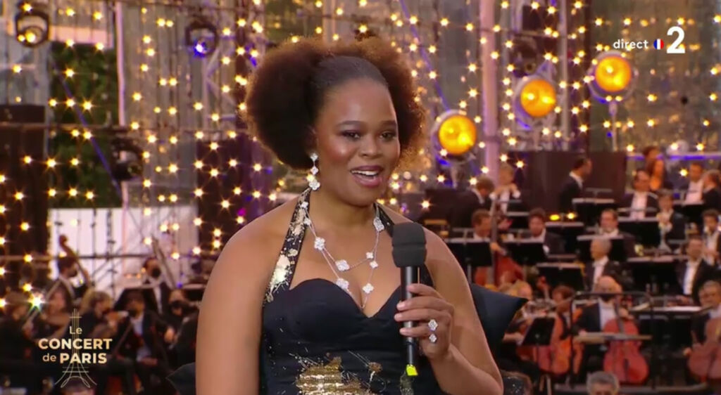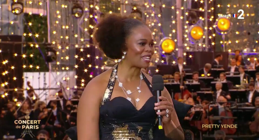 L’artiste lyrique sud-africaine Pretty Yende participait au grand concert symphonique organisé au pied de la Tour Eiffel au Champ-de-Mars à Paris mercredi 14 juillet 2021 pour la fête Nationale retransmis en direct sur France 2 et présenté par Stéphane Berg.