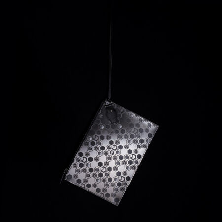 Conçue dans une toile exclusive à la finition argentée et noire, enduite et sérigraphiée à la main avec le monogramme Hexagon, elle capte la lumière avec intensité tout en conservant une allure graphique affirmée.