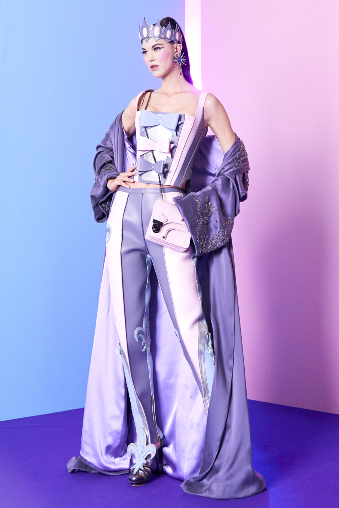 Le premier look de la collection Last Queen est composé d’une armure-corset façon XVIIIe à effets 3D, lassée dans le dos et d’un pantalon.