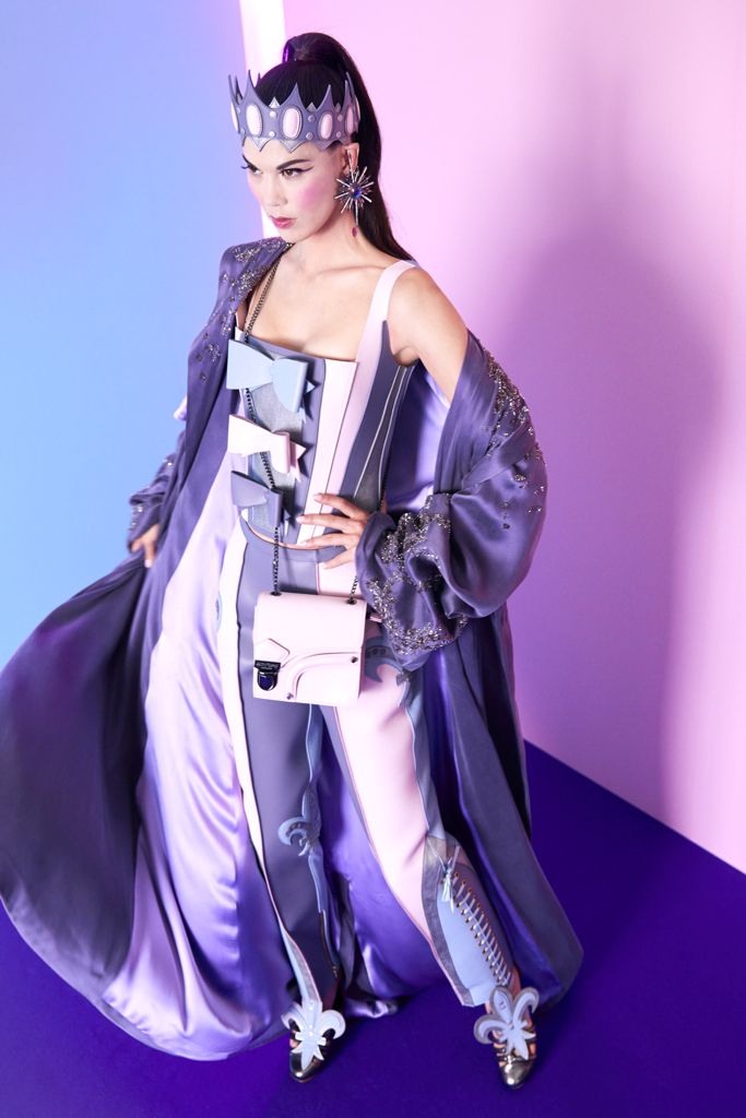 Ce premier look de la collection Haute Couture Last Queen est complété du nouveau sac big bang Bubble Gum.