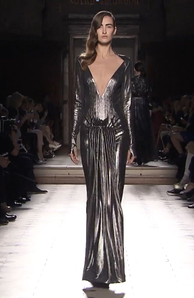 Très architecturée, cette robe sirène détient les secrets du style Julien Fournié : manches gants, grand décolleté V trompe l’œil en tulle illusion et plis plats en cascade qui allonge la silhouette à n’en plus finir.
