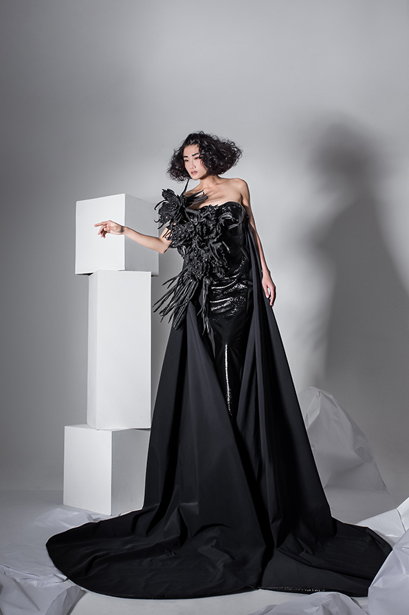 Dans l’atelier confidentiel de la Maison, situé au cœur de Paris, les mains expertes des artisans donnent vie à des pièces d’exception. Les robes sont confectionnées à partir de matières nobles — mousselines aériennes, soies chatoyantes, dentelles précieuses — et sublimées par des broderies réalisées au fil d’or, des incrustations de cristaux, des jeux de transparence et de lumière. Chaque robe exige des centaines d’heures de travail, dans une quête absolue de perfection.