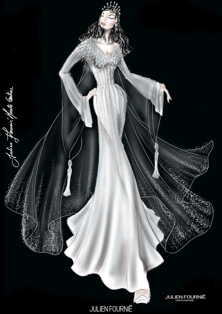Fidèle à son approche de la mode comme langage, Julien Fournié insuffle à ses collections une dimension narrative forte. Ses robes s’inspirent de figures historiques, de héroïnes mythologiques, de muses du cinéma ou de mondes imaginaires. Chaque collection est un chapitre, chaque robe une page d’un conte moderne, entre rêve et réalité.