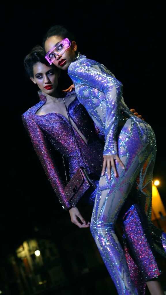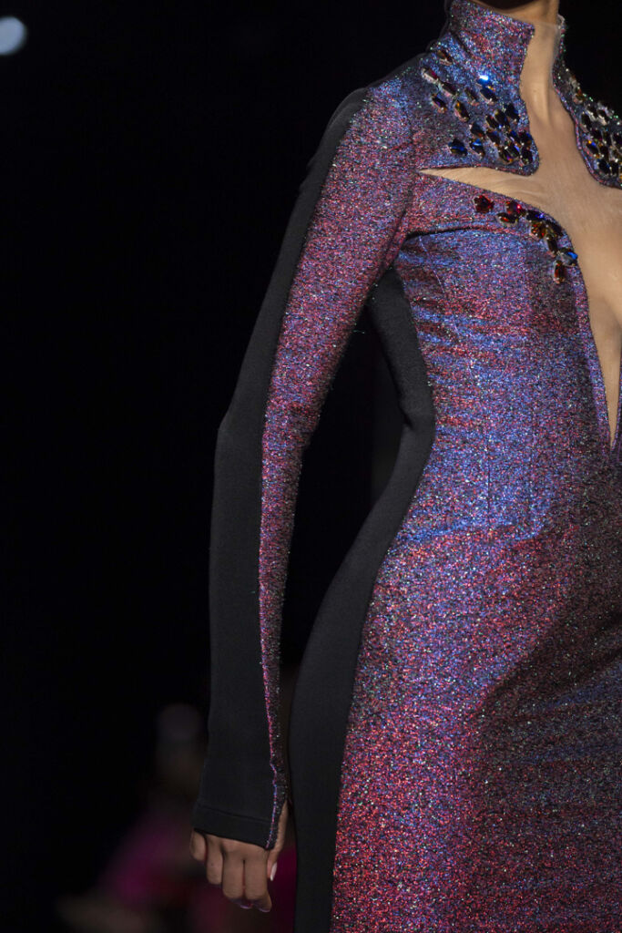 Ce tissus mélange six teintes de lurex différentes sur une base de soie, ce qui confère à cette matière, le scintillement des étoiles et la transformation des couleurs visibles sur les ailes de scarabée. Ce tissage léger, multivers, et changeant n’est pas une broderie. « It’s a game changer ».