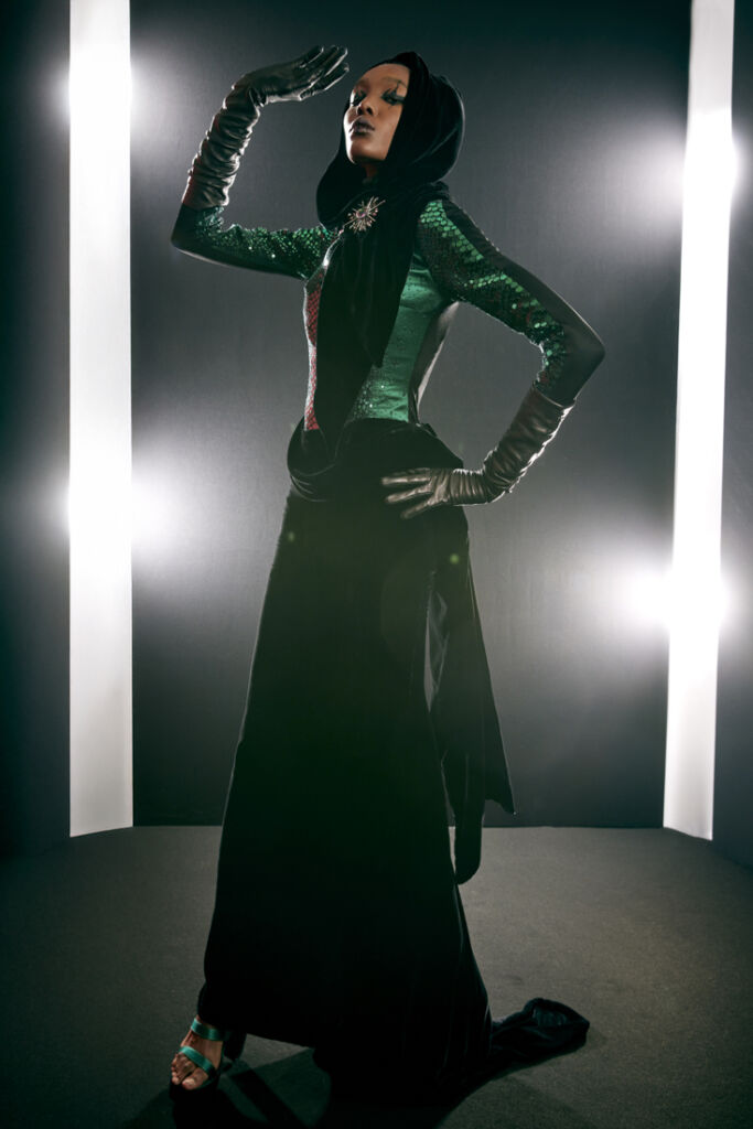 Très vite, la simplicité de la ligne de la robe s’imposait. C’était le matériau que je devais mettre en avant. Je voulais créer un choc visuel comme si un trou noir avait absorbé toute la lumière, c’est pour cela que j’ai décidé d’allier un autre tissu sur cette robe : un jersey de soie et de viscose noir profond, avec une découpe « raie manta ».