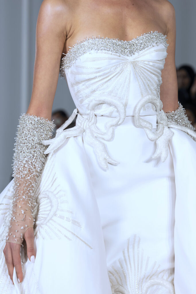 Sur le décolleté et sur les gants de la robe de mariée ont été posé des broderies en tube de cristal à effet constellation scintillante 3D.