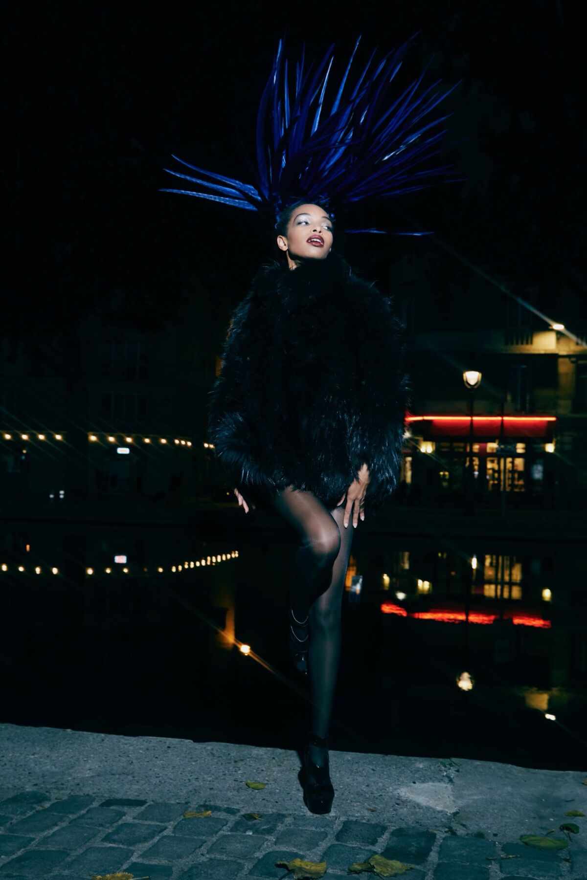 Chloé Etienne porte un manteau boule poilu créé par Julien Fournié et une coiffe de plumes de Julien Vermeulen. Mannequin